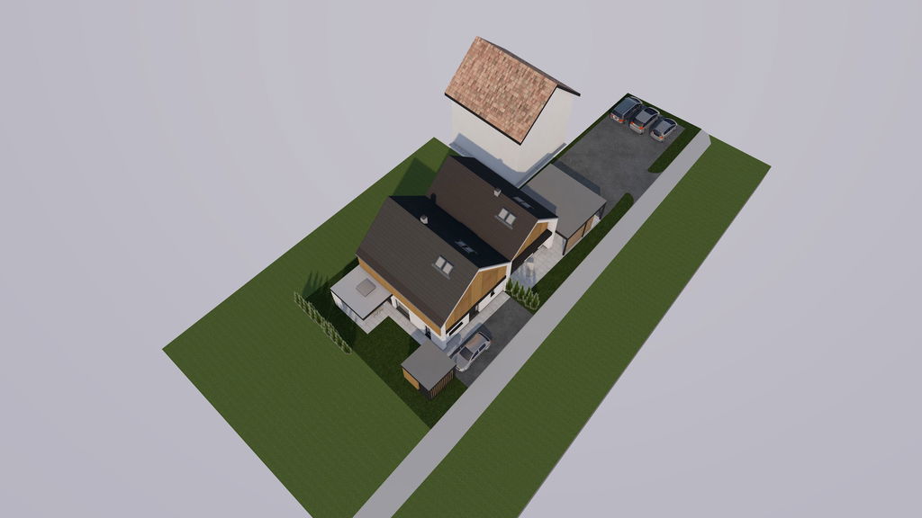 Enota vključuje tudi nadstrešek za dva avtomobila, s površino 49,69 m².